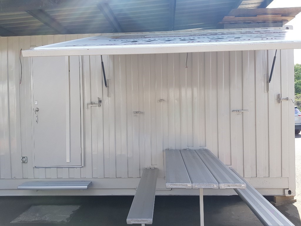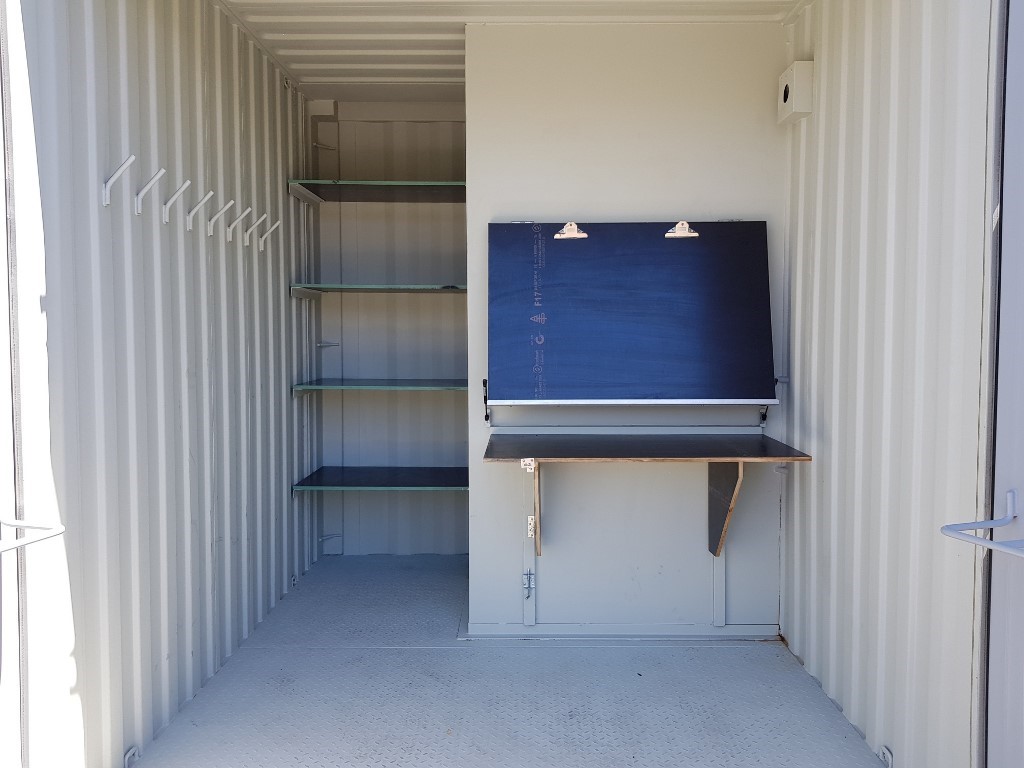 Site storage hub with fully self-contained toilet. The container style site hub has full double doors with storage pockets on the inside of both doors that are perfect for shovels, rakes and brooms, or the dumpy level and tripod etc. Inside is a desk with drafting table, 4 storage shelves and 8 hooks for ropes, chains, leads, etc. The toilet is in the style of a portable toilet, fully self-contained with a hand wash basin, fresh water tank and high capacity waste storage tank.