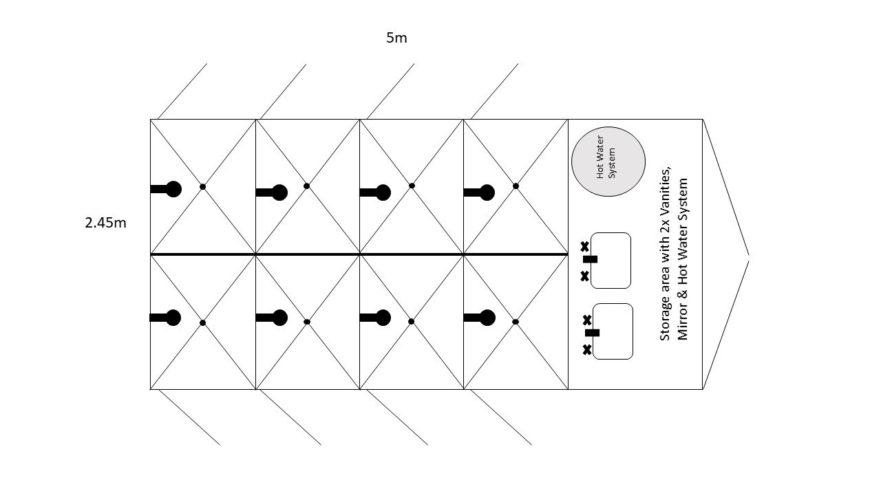 This block is ideal for larger numbers of users or campers. It features 8 shower cubicles with fluorescent lighting, a large electric hot water system, two separate sinks with flick mixer taps, and mirrors. The grey water runs away by gravity, and the fold our steps allow you to step out onto a clean area.